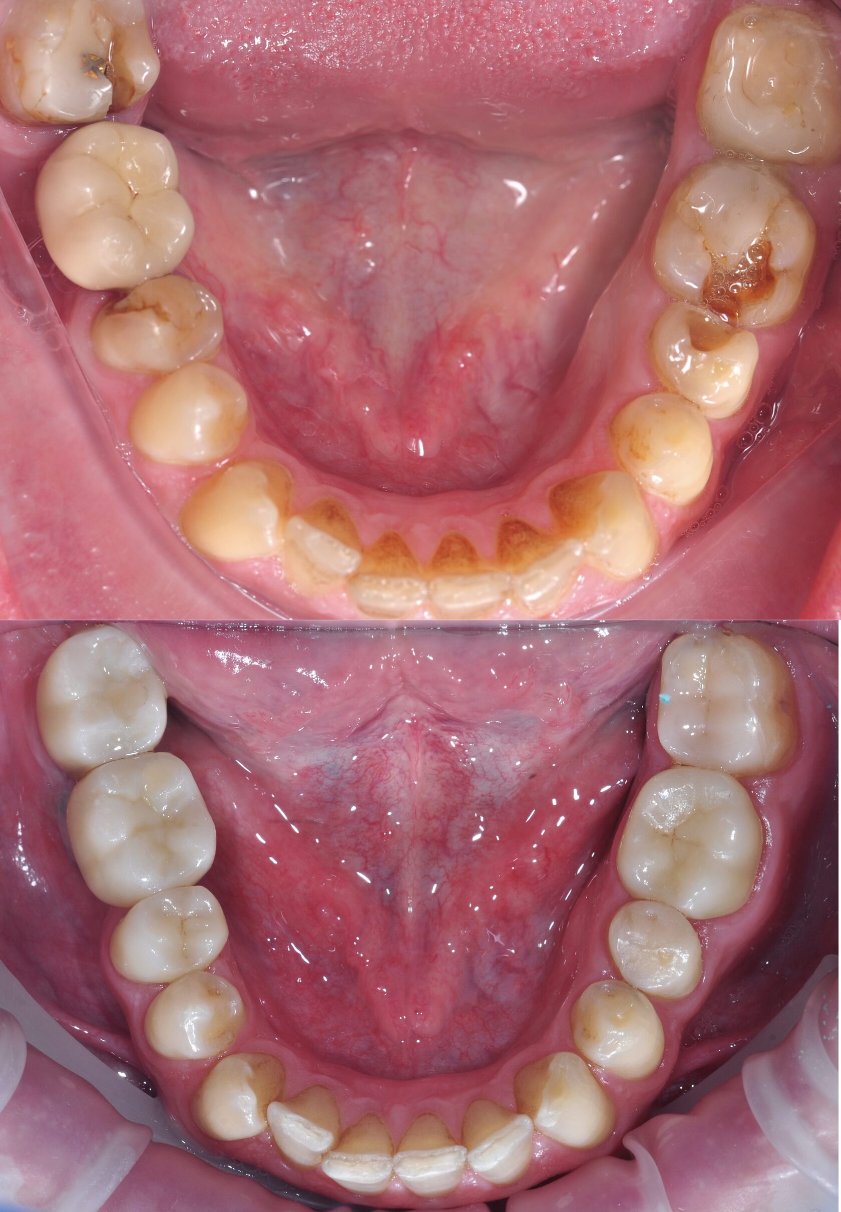 Профессиональная чистка – ультразвук + AirFlow, чтобы убрать налет и камень, также подобрали индивидуальные средства и научили правильно чистить зубы.